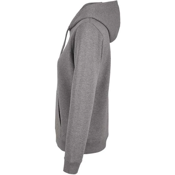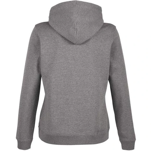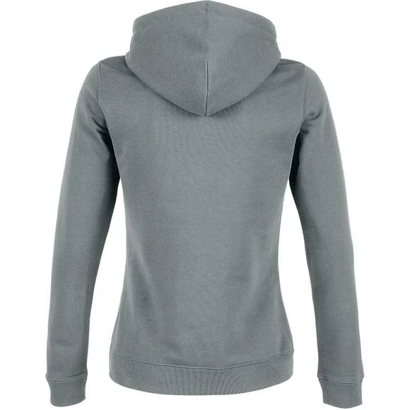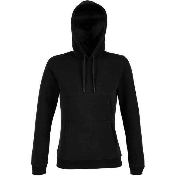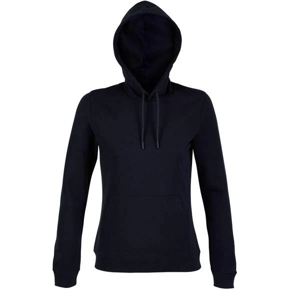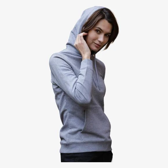 Sweat-shirt à capuche pour femme. Modèle avec poche kangourou, capuche et cordons de serrage. Oeillets et embouts assortis à la couleur du textile. Doublure en Jersey. Finitions en bord-côte 2×2 au niveau des poignets et de la base. Demi lune et bande de propreté à l’interieur du col. Matière French Terry. Composition 85% coton peigné et 15% polyester. Grammage : 400g/m²
