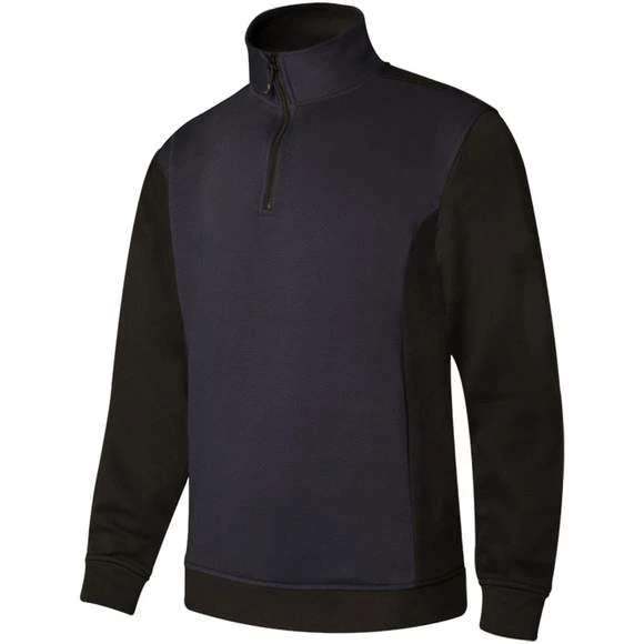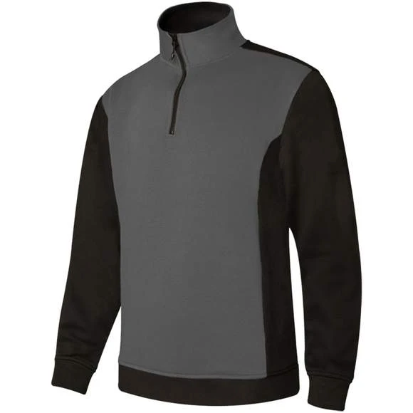 Sweat-shirt mixte. Col montant zippé. Manches, épaules, côtés, intérieur du col et bas du sweat contrastés. Poignets et taille en bords côte. Traité anti-peluche. 65% polyester/35% coton