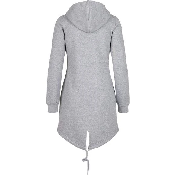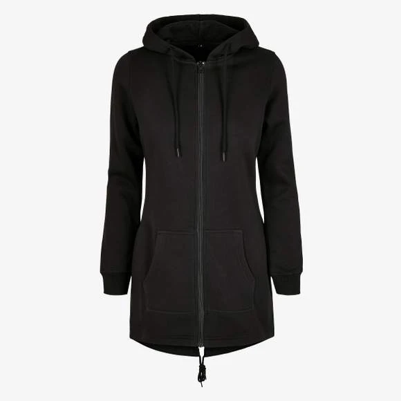 Sweat long à capuche pour femme. Ajustable avec un cordon de serrage interne. Poche kangourou spacieuse. Demi-lune sur l’encolure arrière. Composition : 65% coton, 35% polyester. Grammage : 300g/m²