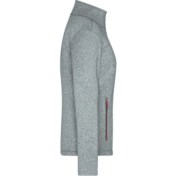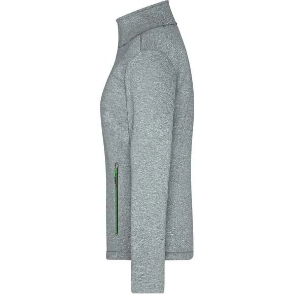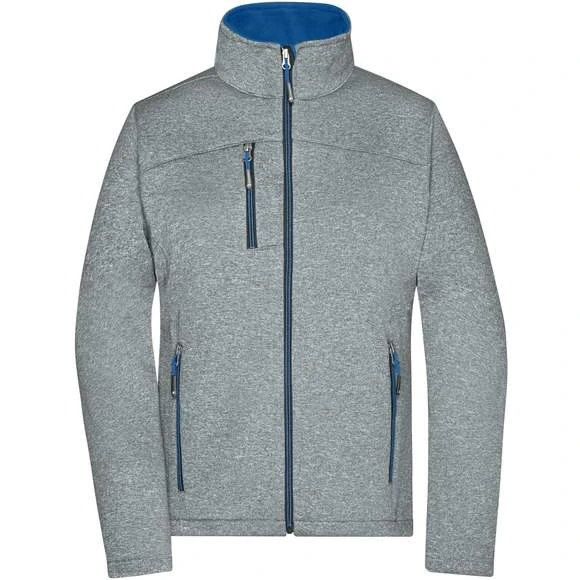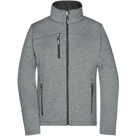 Veste pour femme, légèrement cintrée, légère et douce, style chiné. Softshell à 2 couches, agréable avec intérieur contrastant en polaire. Possède une fermeture zippée ourlée en continu sur le devant avec mentonnière, un col montant ainsi que deux poches latérales et 1 poche poitrine zippée. Composition : 100% polyester. Grammage : 280g/m²