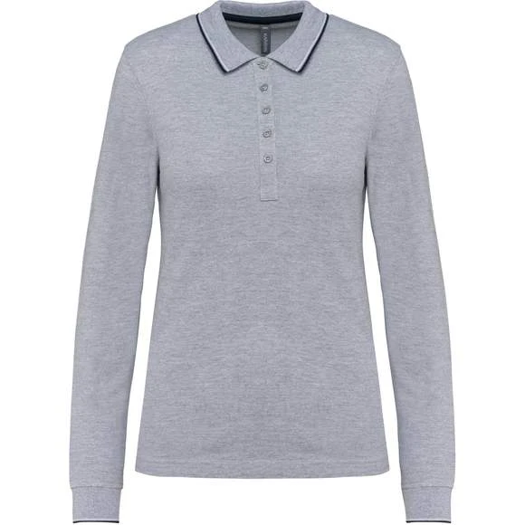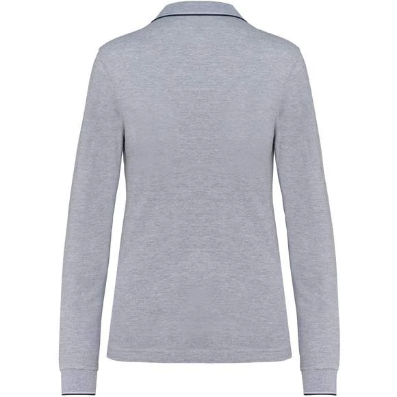Polo maille piquée à manches longues pour femme. Coupe ajustée. Coton peigné. Maille piquée. Col 5 boutons ton sur ton. Renfort épaule en silicone pour un meilleur maintien. Bande de propreté contrastée encolure et fentes côtés en matière principale. Finition bord côte 1×1 avec liserés contrastés col et bas de manche. Finitions double surpiqûres bas de vêtement. Etiquette de marque au col ainsi qu’une puce de taille déchirables pour faciliter la personnalisation. Composition : 100% Coton (Sauf Coloris Oxford Grey : 90% coton et 10% viscose). Grammage : 220g/m²