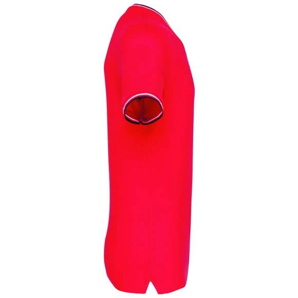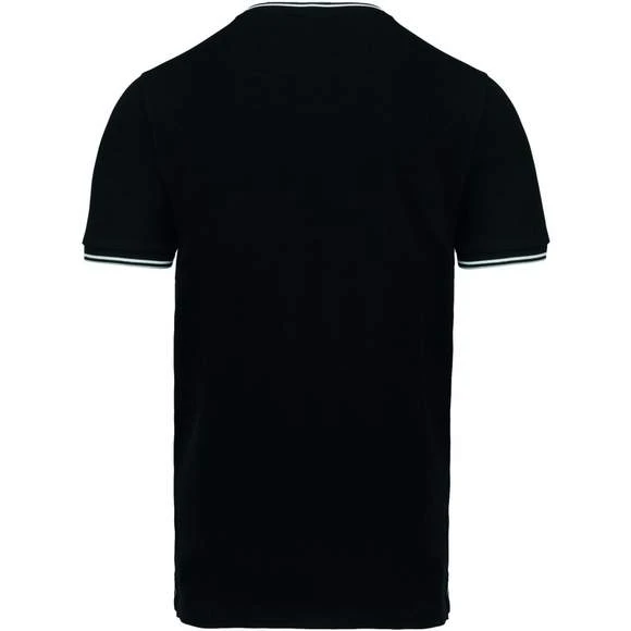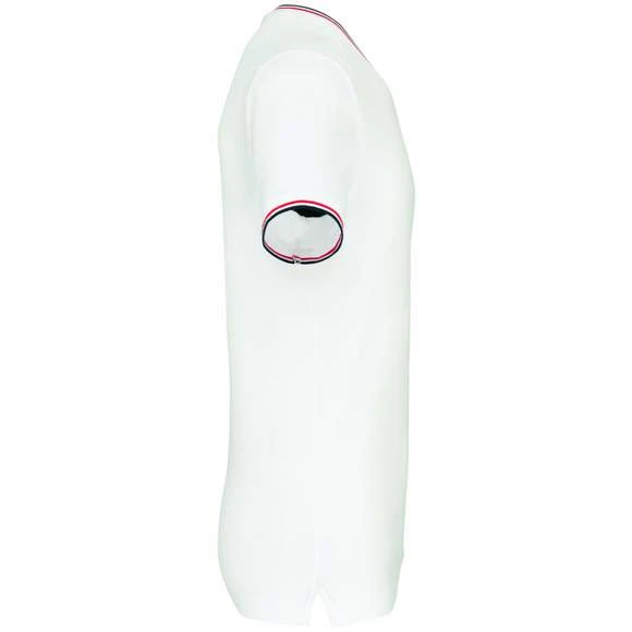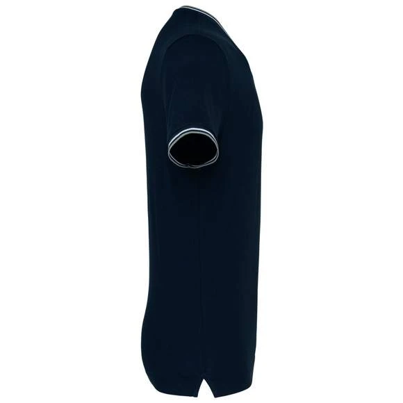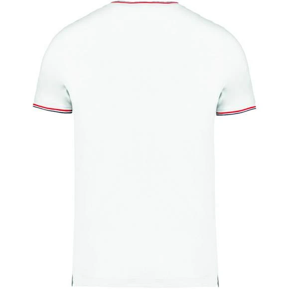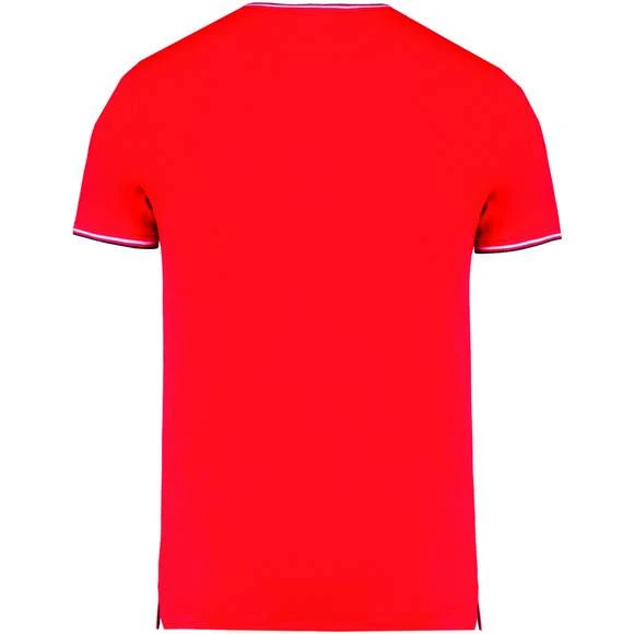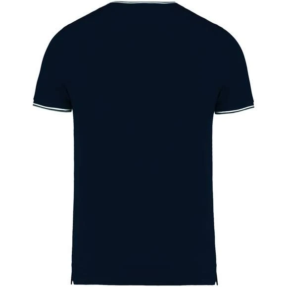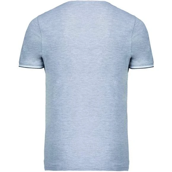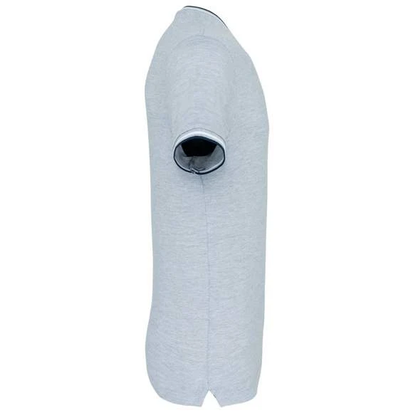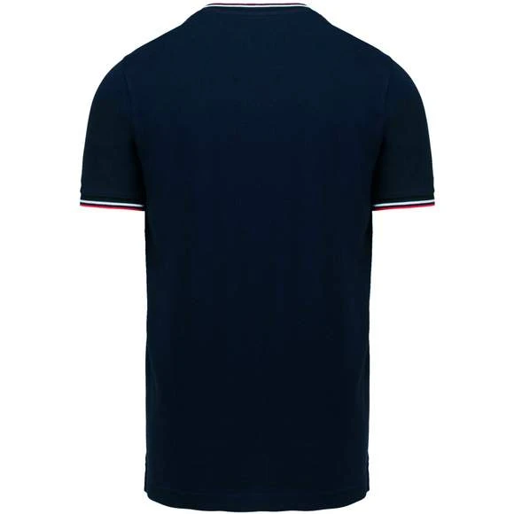 100% coton (90% coton / 10% viscose pour coloris chiné). Maille piquée en coton peigné. Finitions bord-côte avec rayures contrastées au col et bas de manches. Bande de propreté encolure et fentes latérales contrastées. Finition double aiguille au bas du vêtement. Grammage : 170g/m²