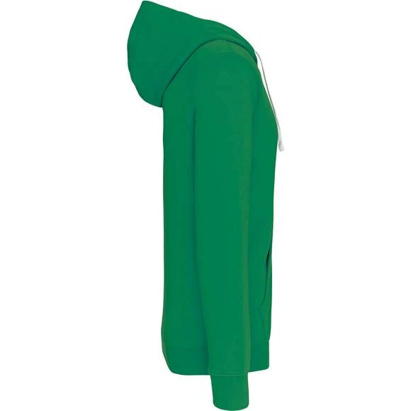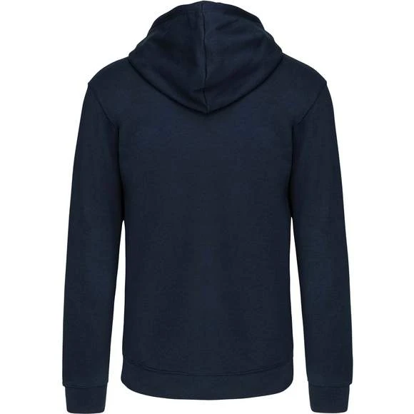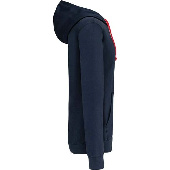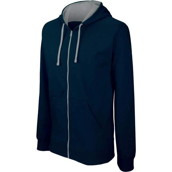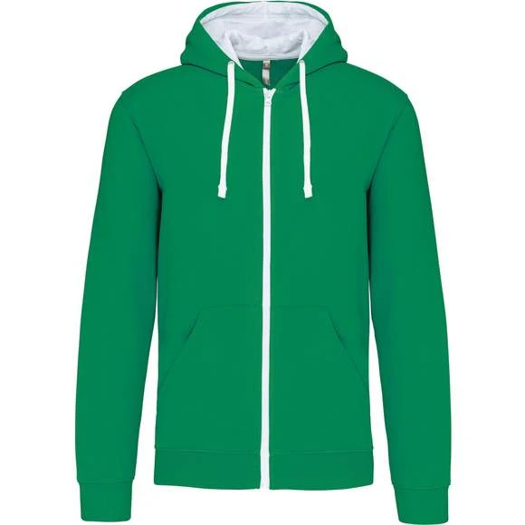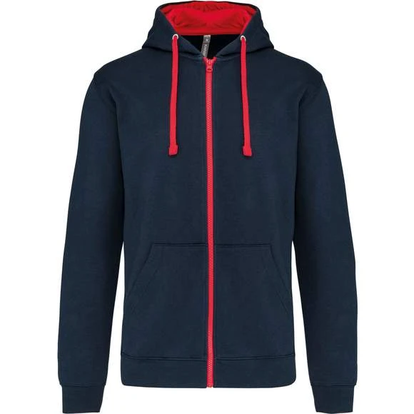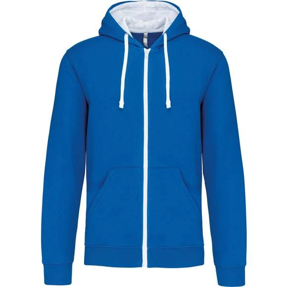 Sweat-shirt zippé capuche contrastée, 80% coton peigné / 20% polyester. molleton gratté. passe fil écouteurs dans la poche kangourou et encolure. bord-côte bas de manches et de vêtement. capuche doublée et contrastée avec cordon de serrage. zip ykk® contrasté Grammage : 280g/m²