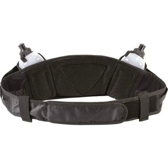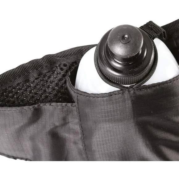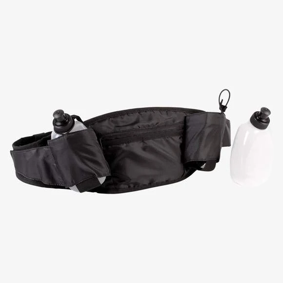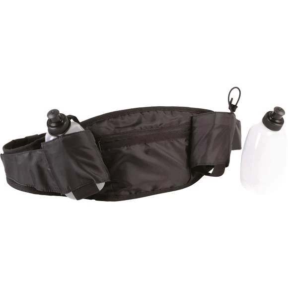 Ceinture porte bidon pour course Ă pied en polyester. Dos matelassĂ© en filet respirant, poche principale zippĂ©e, 2 poches latĂ©rales porte bidon, support Ă©lastiquĂ© porte veste de running / barre energĂ©tique. LivrĂ©e avec deux bidons de 300 ml, fermeture rĂ©glable par bande auto-agrippante. Dimensions : 30×15 cm.