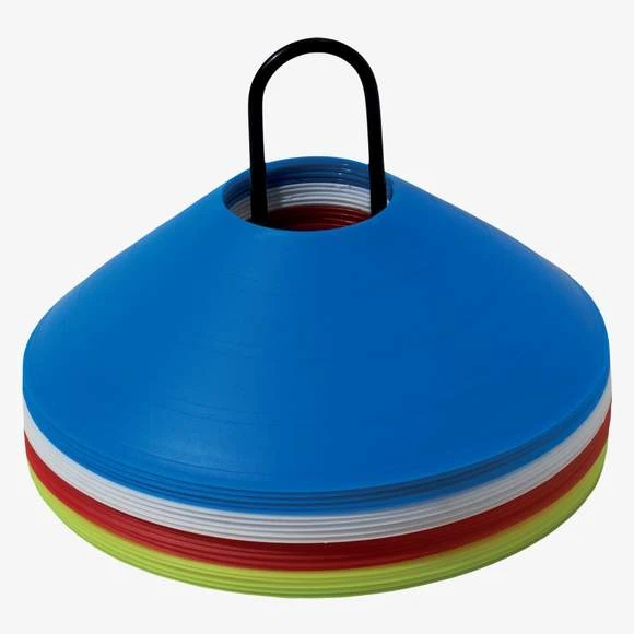 Kit de délimitation conique avec support de transport. Jeu de 20 coupelles (5 pièces x 4 coloris différents) de 5 cm de hauteur.
