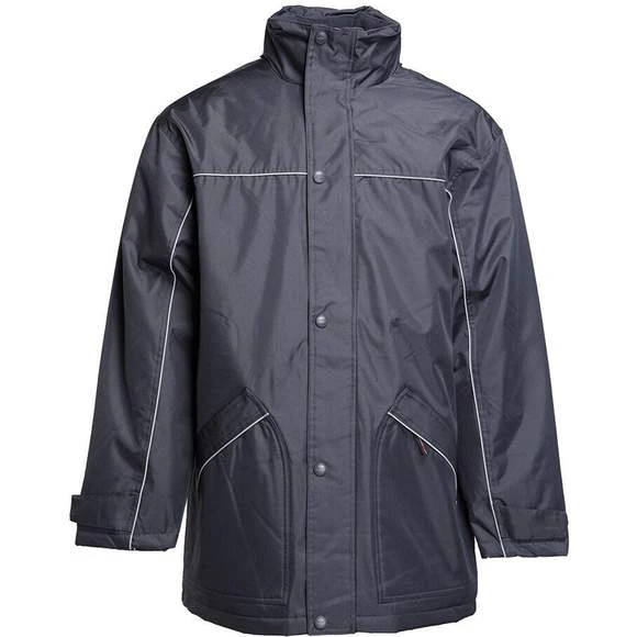 Enduction Imperméable. 2 poches extérieures zippées. 2 poches intérieures. Capuche en oxford dans le col. . Col doublé polaire. Patte auto-agrippante aux manches. Accès pour personnalisation. Passepoil gris aux manches, devant et poches