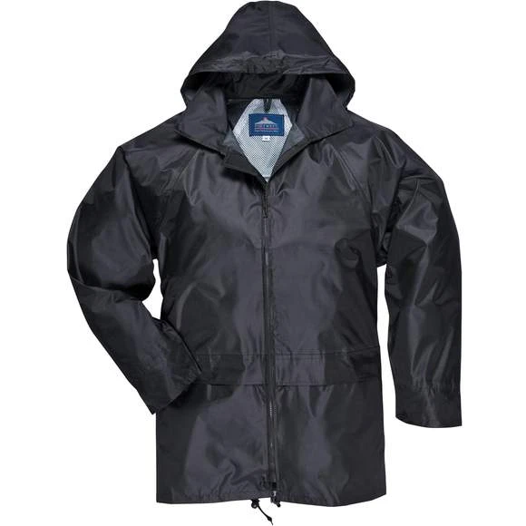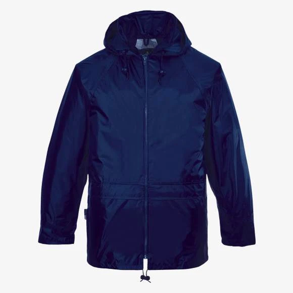 Dispose de deux poches larges à rabats. Capuche et ourlet à cordon de serrage. Poignets élastiques. 100% Polyester enduction PVC. Grammage : 210g/m²
