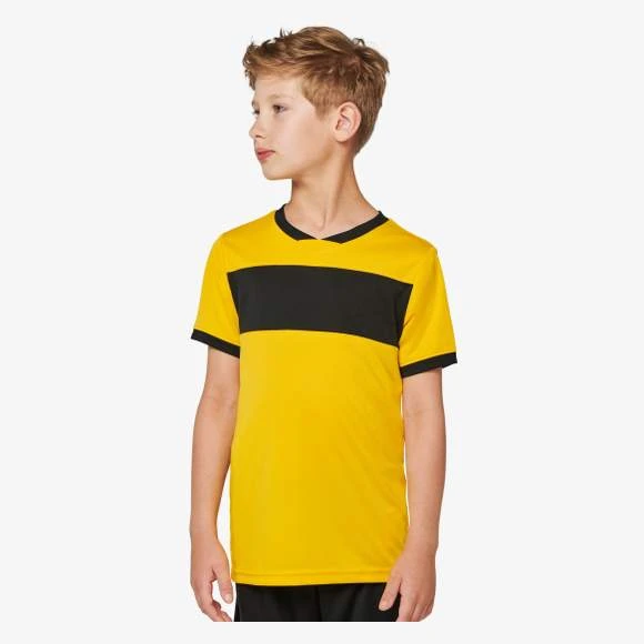 100% polyester. Maille interlock. Tissu à séchage rapide. Col en V avec bande de propreté. Manches montées. Empiècements poitrine, col et bas de manches contrastés. Grammage : 135g/m²