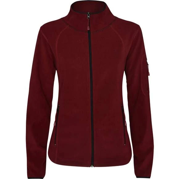 Veste polaire femme pour le sport, col montant et manches longues avec liseré contrasté. Zip central. Poche avec zip sur la manche gauche et zip central, tous deux contrastés. Coutures latérales et poitrine. Coudières ton sur ton. Étiquette détachable. Traitement anti-bouloches. Duo Concept. Composition : 100% polyester micropolaire. Grammage : 300g/m²