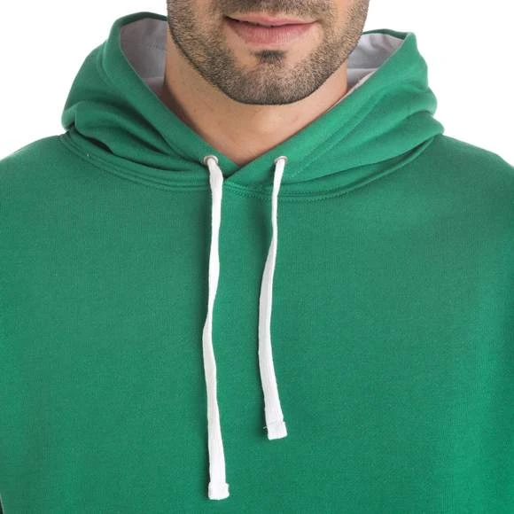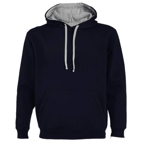 Cordon de serrage contrasté. Poche kangourou. Poignets et ceinture avec élasthanne en côte 1×1.