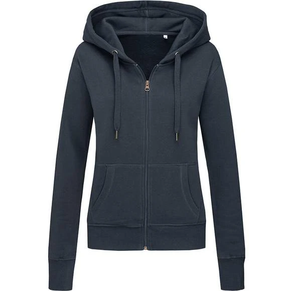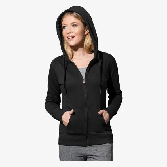 Veste à capuche coupe moderne et sportive pour femmes en mélange coton-polyester de poids moyen avec poche kangourou, bandes côtelées modernes et large cordon. L’intérieur gratté apporte un supplément de chaleur. surface 100% coton, design moderne avec zip et curseur en métal, mélange de coton doux, molleton gratté à l’intérieur, pas d’étiquette de marque dans le cou. surface 100% coton, molleton gratté à l’intérieur, capuche doublée, large cordon avec extrémités en métal (sans nickel), œillets en métal pour le cordon (sans nickel), coutures flatlock décoratives, poche ventrale, zip ton sur ton avec curseur en métal (sans nickel), large bande côtelée avec élasthanne à la base des manches et du bord, bande de propreté, coutures latérales, petite étiquette de taille dans le cou, étiquette d’entretien dans la couture latérale, lavable à 40°C. Composition : 80% coton ring-spun, 20% polyester (GYH: 70% coton, 30% polyester). Grammage : 270g/m²